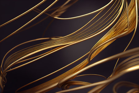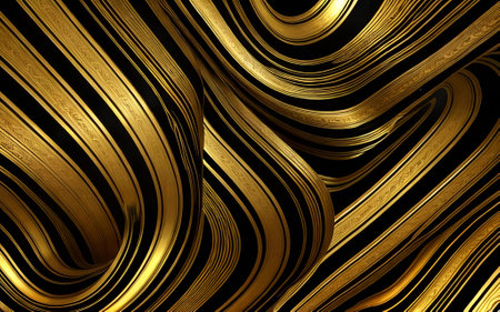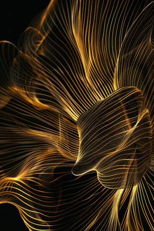 This image features a mesmerizing display of golden, wavy lines against a stark black background. The lines intersect and overlap, creating a sense of depth and movement. The contrast between the golden hue and the dark backdrop enhances the visual impact, making the image both dynamic and captivating.