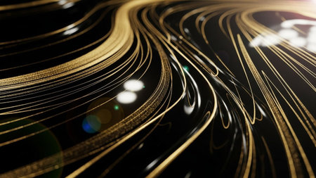 This abstract swirling golden lines that flow dynamically across a dark, highly reflective surface. The lines are thin and delicate, creating a sense of movement and energy. Subtle bokeh effects and lens flares add depth and a touch of magic to the composition. The contrast between the bright gold and the deep black creates a and feel, making it modern and applications.