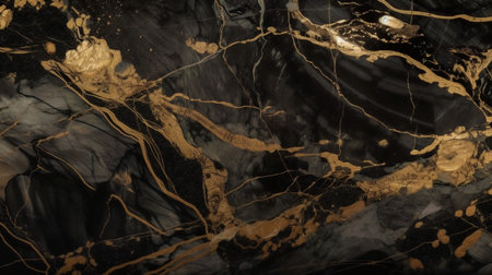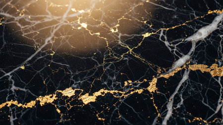 A close-up view of a black marble surface with striking, intricate gold veining. The dark, polished stone provides a dramatic contrast to the bright, irregular lines of gold that run through it. Light reflects off the smooth surface and the metallic gold accents, creating a sense of depth and opulence. This abstract texture is rich and backgrounds or