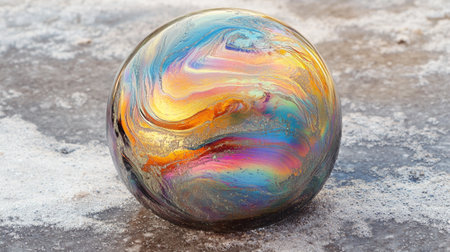 A beautifully crafted glass marble sits on a textured surface, capturing light and casting a gentle shadow, offering a moment of artistic reflection.