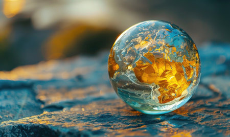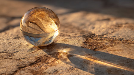 A mesmerizing glass sphere rests on a textured surface, reflecting nature's beauty with warm tones and dramatic shadows, creating a serene composition.