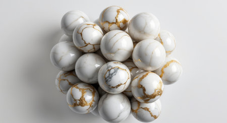 Elegant composition featuring a cluster of white marble spheres. Some spheres have golden accents or veins, creating a luxurious and minimalist aesthetic.