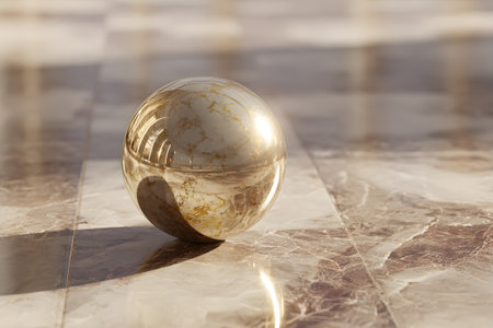 Marble sphere reflecting light on polished floor in bright interior space during afternoon