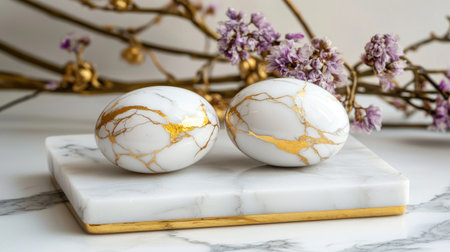 Discover a stunning display of marble eggs with gold veins, elegantly arranged on a decorative tray alongside soft flowers, perfect for enhancing home decor.