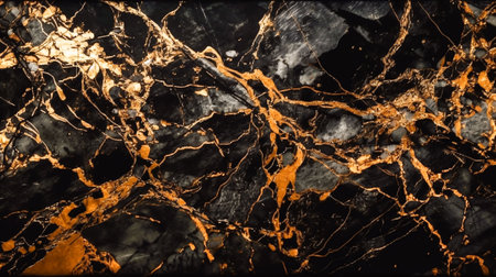 A detailed close-up of a dark, possibly black or deep grey, marble surface is presented. Striking, irregular veins of bright gold run through the stone, creating a dramatic contrast. Fine, intricate cracks, also highlighted with golden hues, web across the surface, adding depth and complexity to the pattern. The texture of the marble is smooth yet detailed, with subtle variations in color and light. This abstract composition showcases the natural beauty and appeal of the