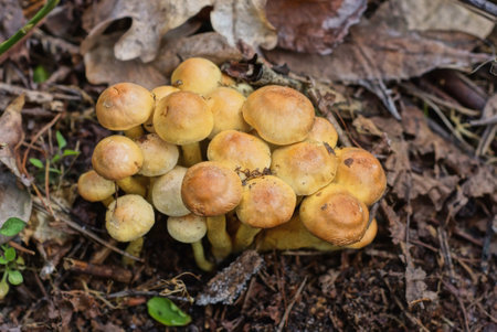 many small brown yellow toadstool mushrooms on the ground in dry fallen leaves in the forest