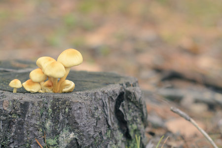 Yellow mushrooms growing on tree trunk and forest mulch in autumn in forest.