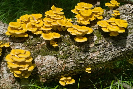 orange mushrooms on the trunk, close up view.