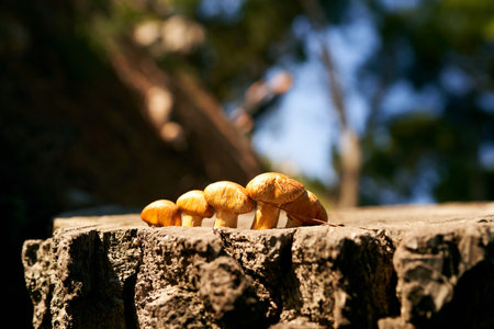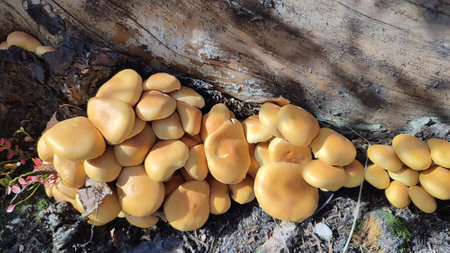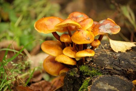 Wild mushrooms on a stump. Mushrooms of the Physalacriaceae family. Natural background.