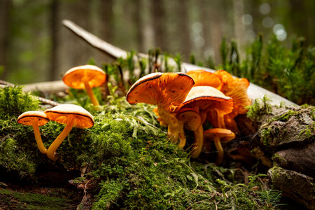 A captivating close-up photograph of vibrant orange mushrooms thriving amidst lush green moss in a mysterious forest setting.