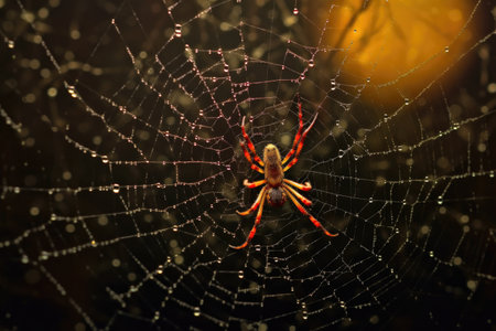 A close-up of a spider in the center of a golden web with dew drops glistening in the morning light, evoking a sense of natures intricate beauty.. AI Generation