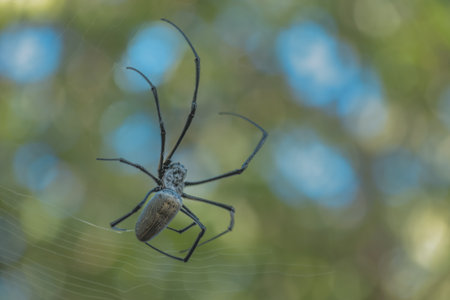 Golden Orb Weaver Spider Suspended in Web with Natural Light, Detailed Body and Long Legs Against Soft Green and Blue Bokeh Background