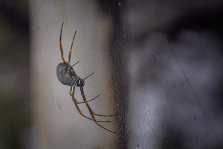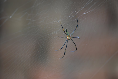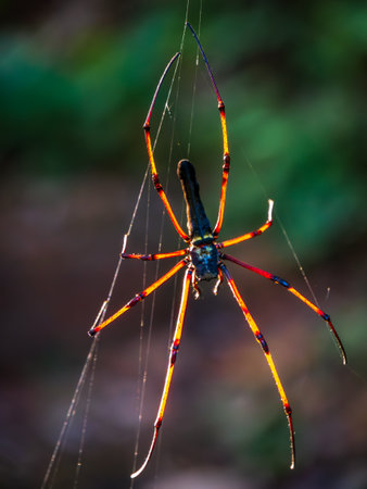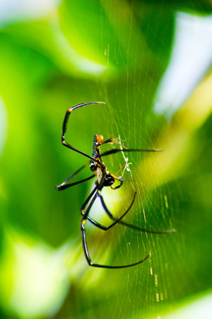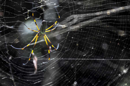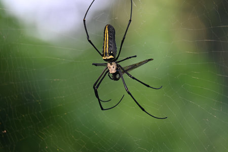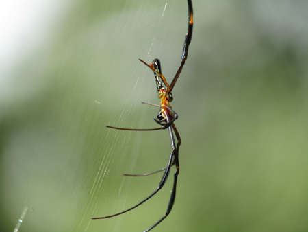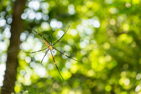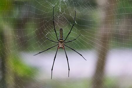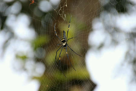 Nephila pilipes spider. Its other names golden orb weaver and giant golden orb weaver. This is a species of golden orb web spider. A big spider on its web in the forest.