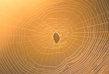 A stunning close-up of a spider gracefully suspended in its delicate web, illuminated by warm, golden light. The intricate patterns of the web and the spiders striking striped body create a captivating scene that evokes a sense of wonder and natures artistry.