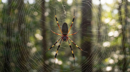 Spider weaving an intricate web, capturing the complexity and beauty of its silk threads. Creepy carnivore making a protective armor outdoor. Generative AI