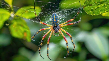 A striking image of a colorful spider skillfully weaving its intricate web amidst lush green leaves, showcasing the beauty of nature and wildlife in a tropical setting.