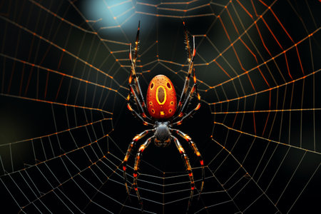 illuminated spider web with hidden spider in darkness, created with generative ai