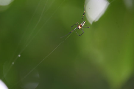 A spider is waiting for prey in its web, blurred green leaves background, nature concept