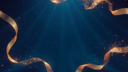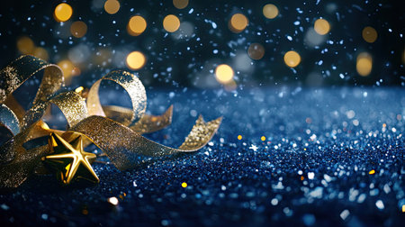 A mesmerizing arrangement of sparkling gold ribbons and a star on a deep blue background, creating a festive and joyful atmosphere for celebrations.
