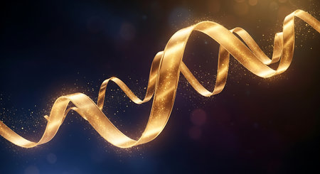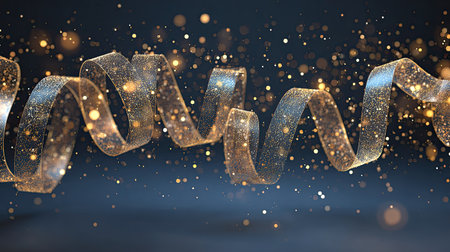This captivating image showcases a swirling golden ribbon adorned with shimmering particles, set against a dark background, ideal for festive themes and creative projects.