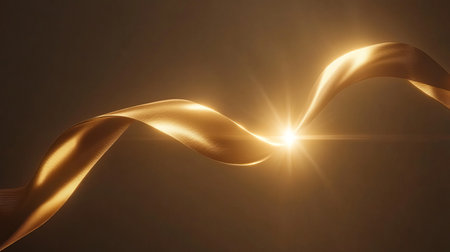 A golden ribbon gracefully curves against a dark background, illuminated by a soft, warm light. The ribbon's metallic sheen catches the light, creating a striking contrast with the surrounding darkness.