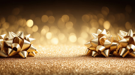 Beautiful gold bows sit atop a sparkling background, adding elegance to any celebration. Perfect for festive occasions and holiday decorations.