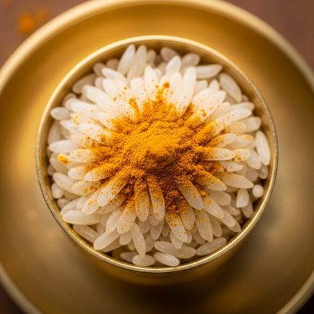 Hero detail shot of Akshat (turmeric rice) in a square format, focusing intensely on the texture and