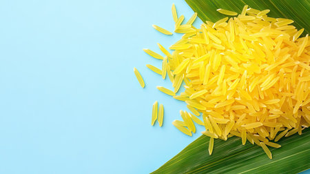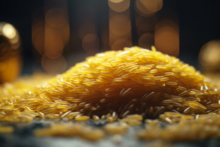 A detailed close-up of yellow rice grains, highlighting their smooth and glossy texture, ideal for food-related projects, recipes, or culinary designs.