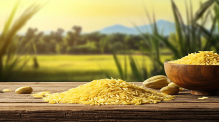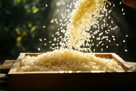 Rice grains falling onto a rustic wooden tray with in a warm natural setting