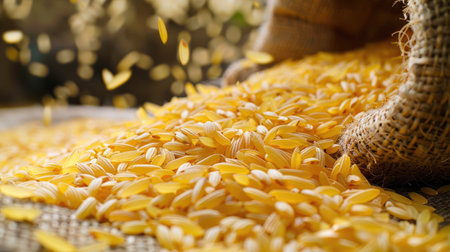 Close-up of golden-yellow rice husks pouring from a sack