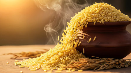 Steaming rice spills from pot on wooden table, warm sunlit background.
