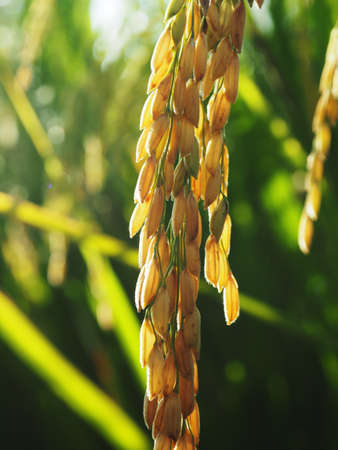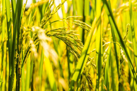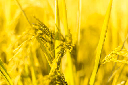 Close up of Yellow paddy rice plant on field and sunlight