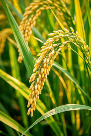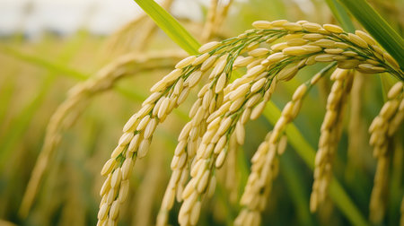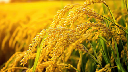 Golden rice ears, heavy with grain, ready for harvest in a lush green paddy field. close up view with soft morning light, symbolizing agriculture, food, and abundance.