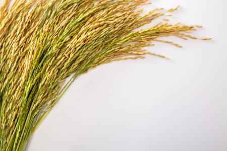 Close-up of a golden rice ear with green leaf, isolated on a white background, capturing the intricate details of the grain and leaves