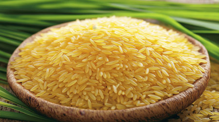 Golden-yellow rice grains glistening in the sun, surrounded by vibrant green leaves in a serene field