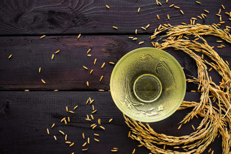 Ripe ears of rice in a womans hand. Products from rice concept. Rice flakes, flour, drink, rice sake vodka