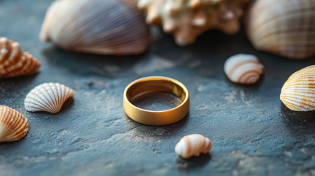 A stunning gold ring placed elegantly among various seashells on a dark surface. This captivating image evokes a sense of nature and tranquility, perfect for themes of love and celebration.