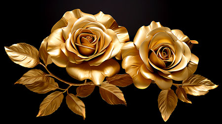 A bouquet of golden metallic roses gracefully arranged on a pitch-black background, with delicate, detailed petals shining in a luxurious and elegant display.