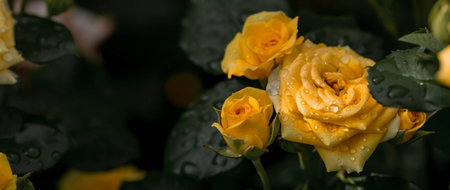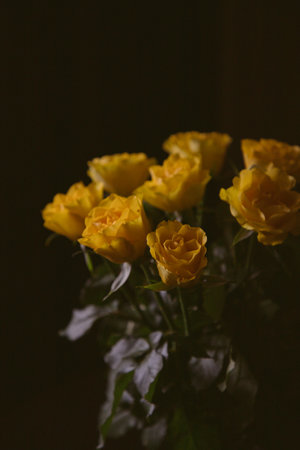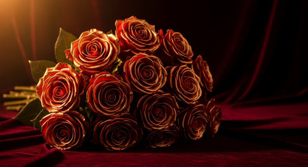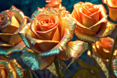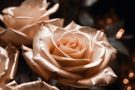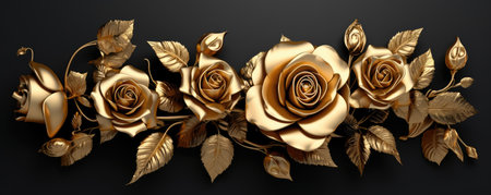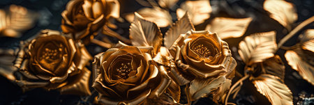 Close-up of beautiful golden roses on a dark background, highlighting their intricate textures and luxurious appearance, perfect for decorations.