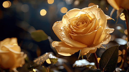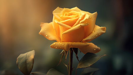 A stunning close-up of an elegant golden rose flower adorned with delicate water droplets. The soft bokeh background creates a warm, inviting atmosphere.