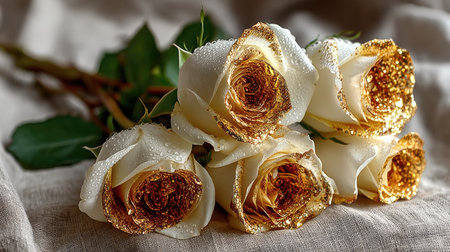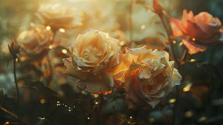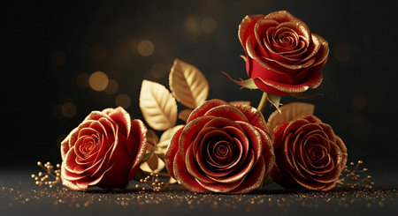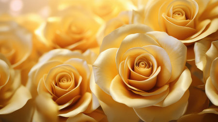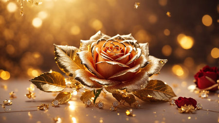 AI generative image of golden roses and little diamonds with luxury mood and tone of gold, close up the flowers, the concept for wedding or valentine, falling golden glitters, landscape image.