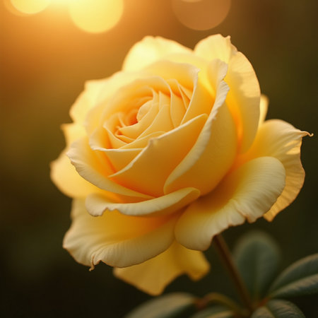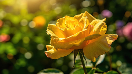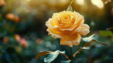 A magnificent, vibrant yellow rose in full bloom captures attention with its delicate petals, beautifully illuminated by warm sunlight. This stunning floral image showcases the rose in a lush garden setting, perfect for conveying romance, beauty, and the freshness of nature. Ideal for wedding invitations, romantic imagery, or botanical projects, the closeup macro detail highlights the bloom's elegant form and sunny color against a blurred bokeh background. Explore the beauty of summer and spring with this captivating image.