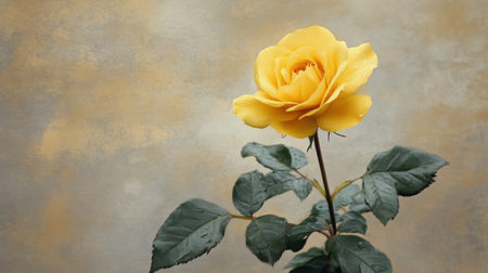 Yellow rose with dewdrops against a textured background. Nature and beauty concept