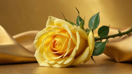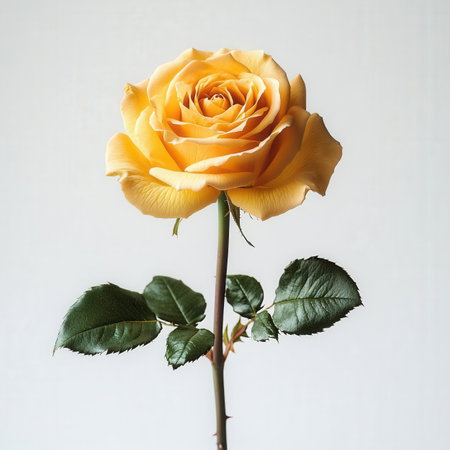 A stunning yellow rose stands gracefully against a soft background, exuding beauty and elegance. This close-up captures the delicate petals and vibrant colors.