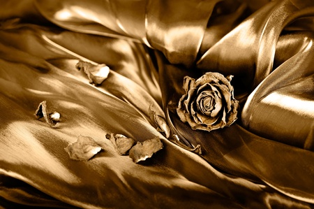 Vintage background: Dry rose on satin. Gold colored image, shallow depth of field