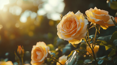 A captivating view of yellow roses in a blooming garden bathed in gentle sunlight, showcasing nature's beauty and creating a warm atmosphere perfect for relaxation.