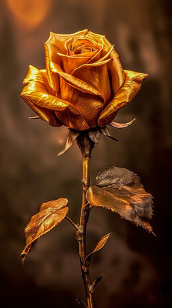 A captivating golden rose stands majestically against a dark background, symbolizing beauty and elegance. This stunning floral capture evokes feelings of luxury and romance, perfect for artistic displays or special occasions.