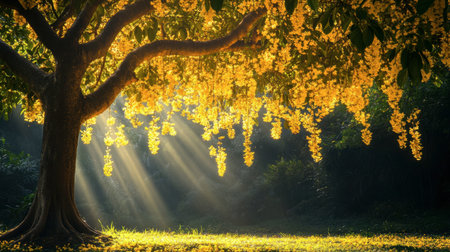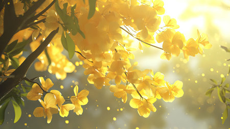 A stunning scene showcasing vibrant yellow flowers cascading from tree branches, illuminated by soft sunlight, creating a tranquil atmosphere in nature.