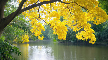 A stunning yellow blossom tree gracefully hangs over calm water, surrounded by lush greenery. This tranquil scene captures the beauty of nature's vibrant colors and peaceful environment.