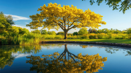 A tranquil autumn scene showcasing a vibrant yellow tree reflecting beautifully in calm waters, surrounded by lush greenery and a clear blue sky.